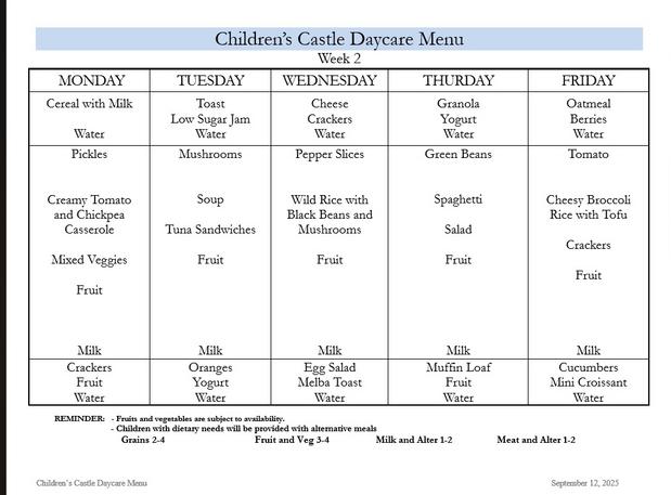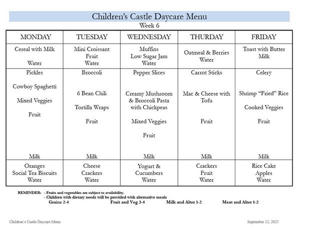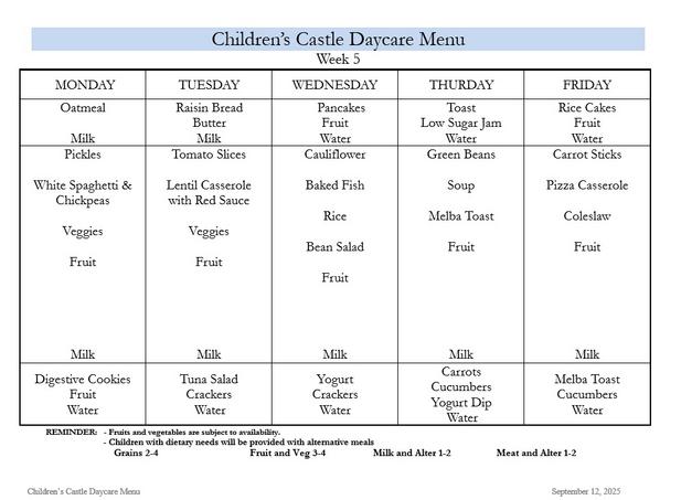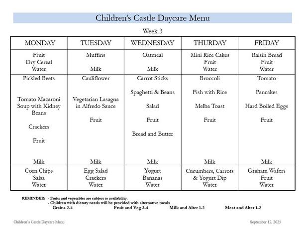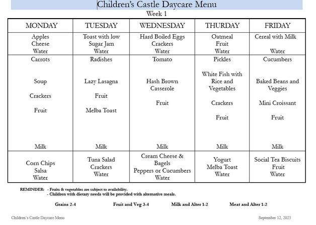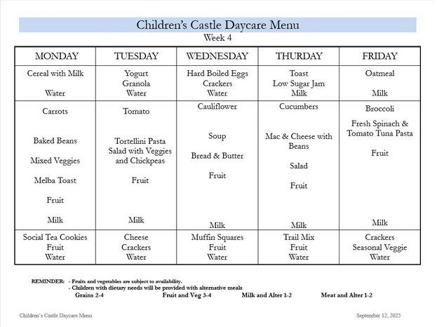 Below are examples of our Menus. They are subject to change and changes can be seen on the kitchen and classroom copies.
